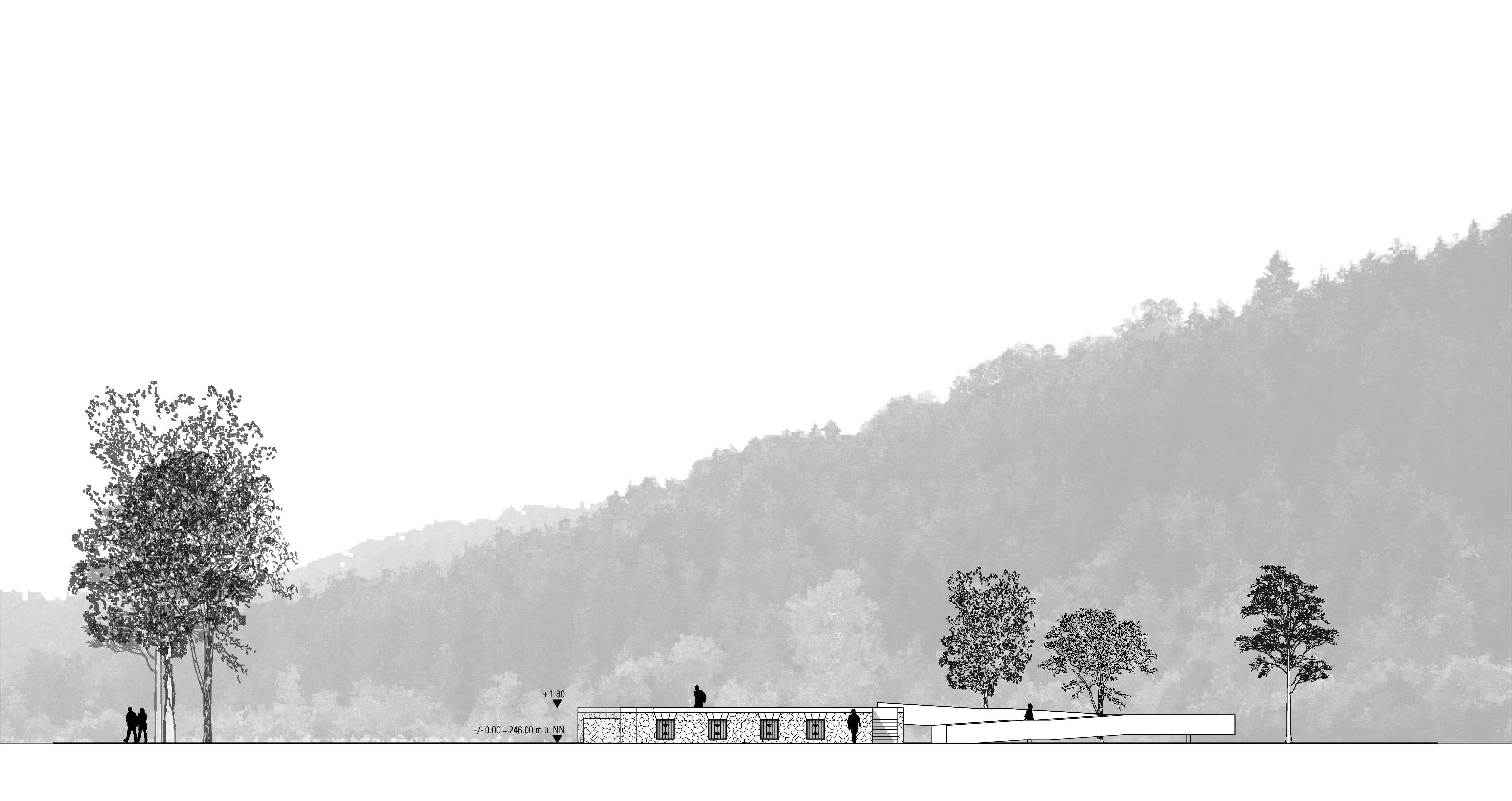 Der Bauschutt aller oberirdischen Wände wird in die leeren, nach oben hin offenen Kellerräume geschüttet. Das zentrale Element des Entwurfes ist ein gleichseitiges Dreieck, welches emblematisch mitten in die Kellergemäuer der alten Kommandantenvilla hineingestanzt wird und dessen Funktionslogik damit durchbricht und negiert. Dieses Emblem erinnert in seiner Form an die verschiedenfarbigen Winkel, nach welchen die KZ-Häftlinge kategorisiert wurden. Diese Winkel erfuhren später einen Aneignungsprozess durch die Opfer und sind auch heute noch für viele gesellschaftliche Gruppen identitätsstiftend.