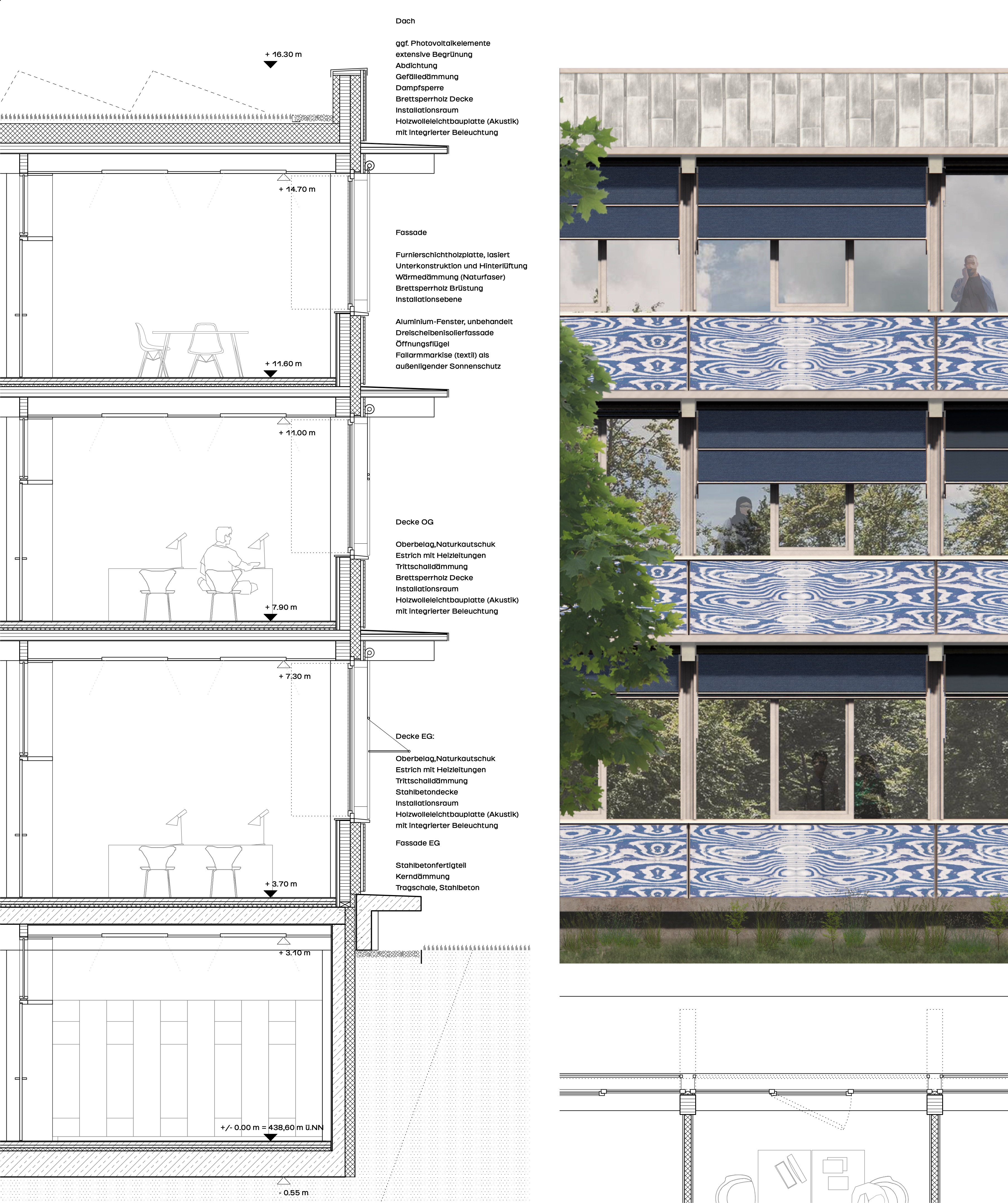 Bei der Konstruktion handelt es sich um einen Holzskelettbau, der auf einem Hang-Geschoss aus Stahlbeton steht. Die opaken Fassadenelemente sind aus blau gebeizten Furnierschichtholzplatten gefertigt und schimmern dadurch auf verspielte Art und Weise in bläulich-weißen Farbtönen.