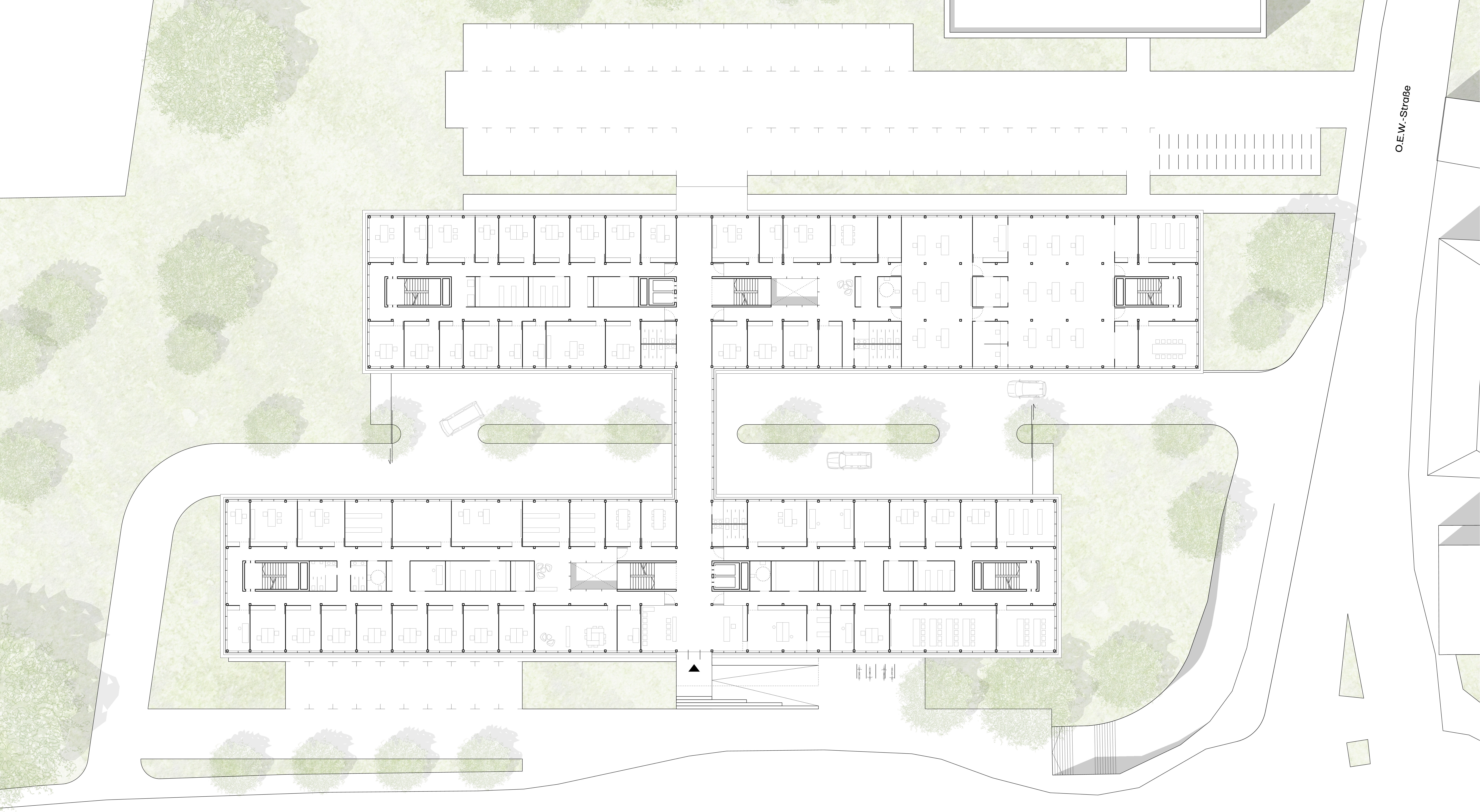 Auf eine weitläufige Einfriedung des Grundstücks kann verzichtet werden, da die Dienstfahrzeuge der Polizei im Bereich zwischen den Gebäudeteilen unterhalb der Baukörper im Erdgeschoss geparkt werden können. Dies erzeugt eine weniger abweisende Geste als die geforderte Einfriedung und stellt einen wesentlichen Aspekt des städtebaulichen Entwurfes dar.