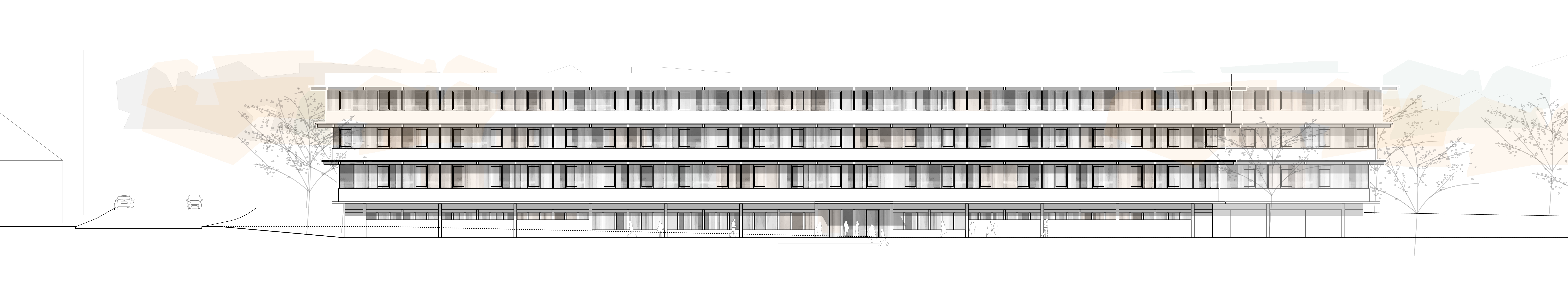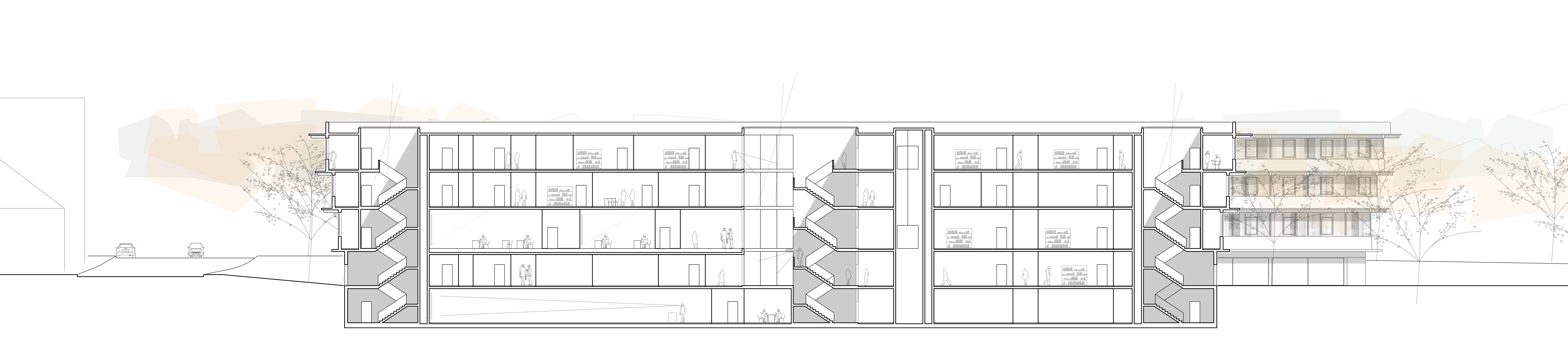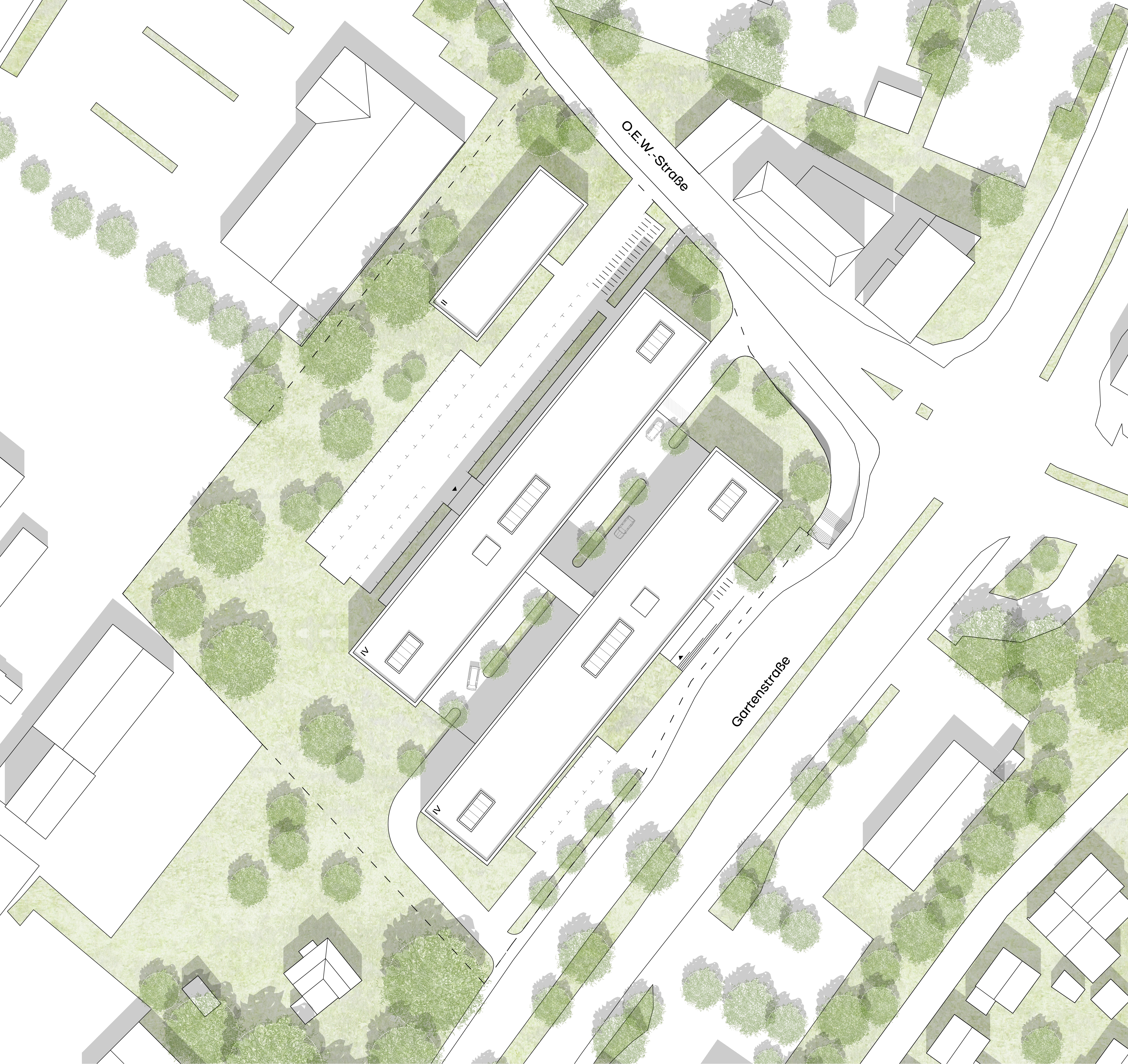 Aufgrund ihrer prägnanten stadträumlichen, topografischen und erschließerischen Rolle stellt die Ausrichtung der Gartenstraße ein wesentliches Entwurfsparadigma dar. Der Entwurf betont die Längsseite seines Grundstücks und flankiert zugleich den Straßenraum mit einer langen, dreigeschossigen Fassade. Die Richtung wird umso mehr betont, als sich ein zweiter Gebäudeteil gleicher Größe und Form hinter den vorderen stellt. Die beiden Gebäudeteile greifen das dynamische Wesen der Straße auf, indem sie sich in ihrer Längsrichtung zueinander verschieben. Diese Dynamisierung des Ensembles wird auch in den Gebäudekubaturen aufgenommen, da die Geschosse nach oben hin stetig etwas länger werden, wodurch die horizontale Ausrichtung der Baukörper zusätzlich betont wird.